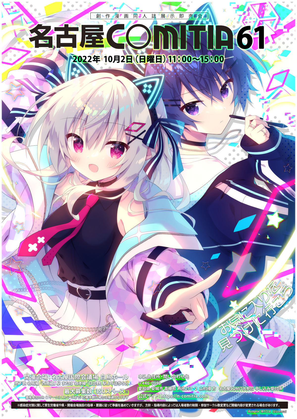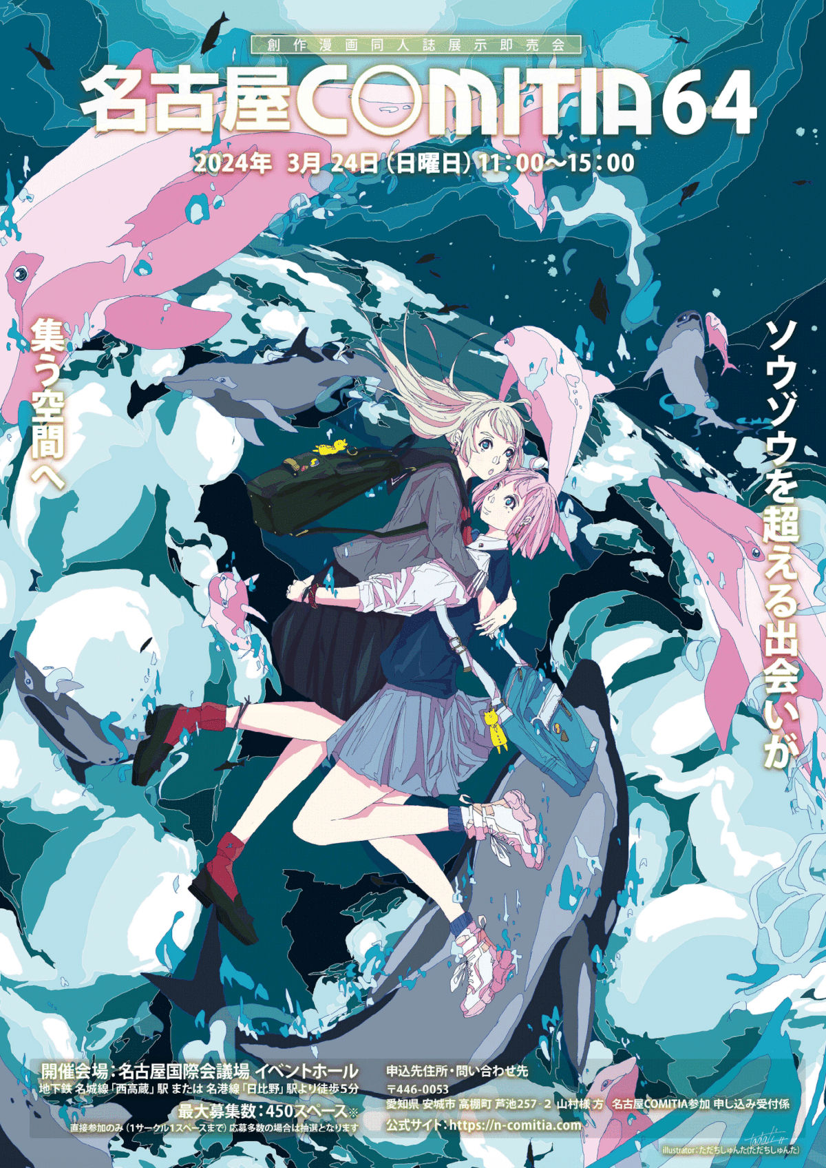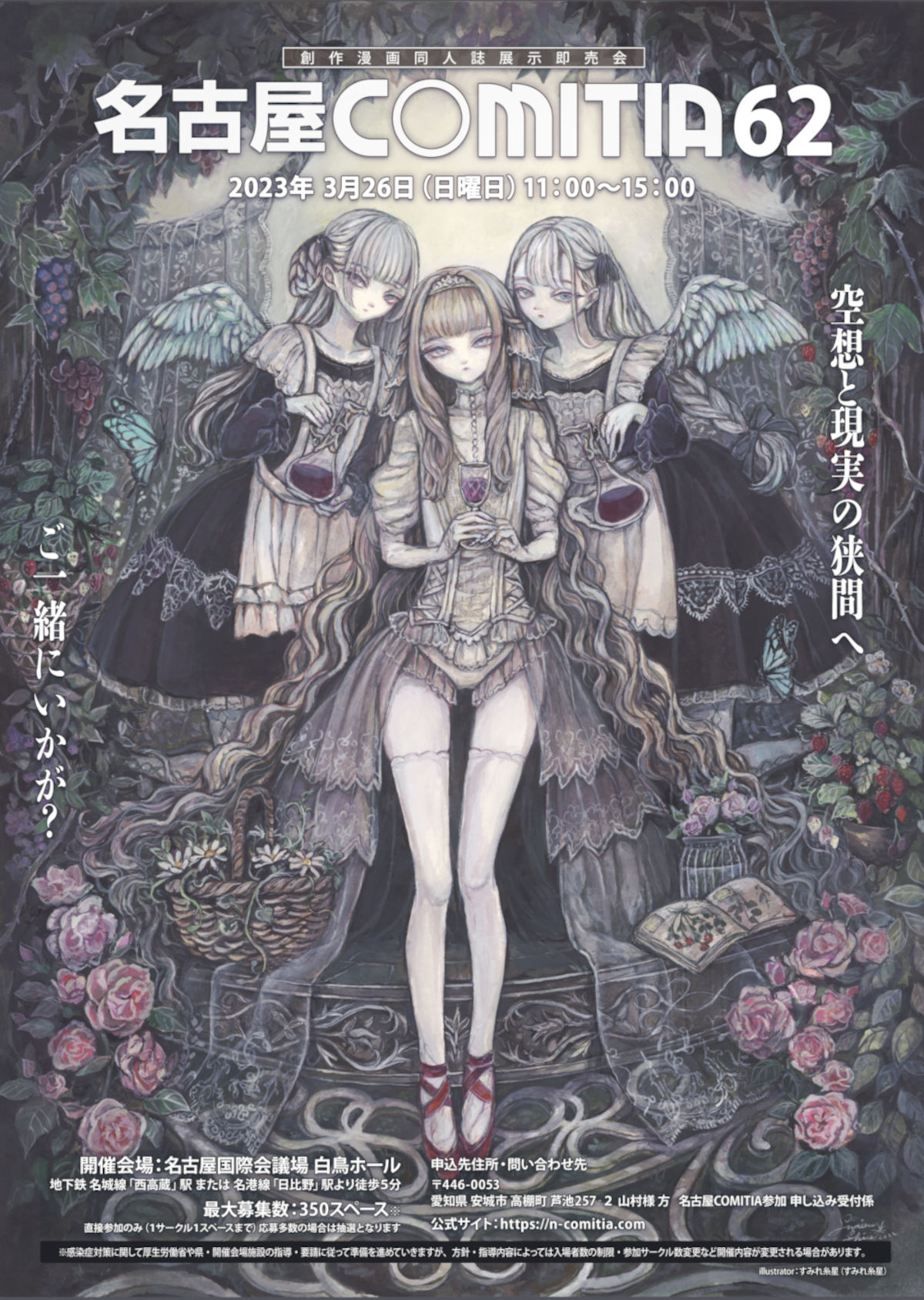 ヒストリー:最新〜61 最新〜61 60〜31 30〜01 名古屋COMITIA67 開催日時:2025年08月24日(日曜日)11:30−15:30 開催場所:名古屋市中小企業企業振興会館 吹上ホール 第1・2ファッション展示場 参加サークル数:524スペース チラシ イラスト:真鍋鈴(沙羅双樹) 名古屋COMITIA66 開催日時:2025年02月22日(日曜日)11:30−15:30 開催場所:名古屋市中小企業企業振興会館 吹上ホール 第1ファッション展示場 参加サークル数:415スペース チラシ イラスト:myaaco(Bitty Blue Bird) 名古屋COMITIA65 開催日時:2024年09月29日(日曜日)11:00−15:00 開催場所:名古屋国際会議場 イベントホール 参加サークル数:518スペース チラシ イラスト:刹那よね(刹那主義) 名古屋COMITIA64 開催日時:2024年03月24日(日曜日)11:00−15:00 開催場所:名古屋国際会議場 イベントホール 参加サークル数:460スペース チラシ イラスト:ただちしゅんた(ただちしゅんた) 名古屋COMITIA63 開催日時:2023年09月17日(日曜日)11:00−15:00 開催場所:名古屋国際会議場 白鳥ホール 参加サークル数:315スペース チラシ イラスト:hirame(hanatsumugi) 名古屋COMITIA62 開催日時:2022年03月26日(日曜日)11:00−15:00 開催場所:名古屋国際会議場 白鳥ホール 参加サークル数:314スペース チラシ イラスト:すみれ糸星 (すみれ糸星) 名古屋COMITIA61 開催日時:2022年10月2日(日曜日)11:00−15:00 開催場所:名古屋国際会議場 白鳥ホール 参加サークル数:310スペース チラシ イラスト:神代ぴよ(piyomew) 最新〜61 60〜31 30〜01